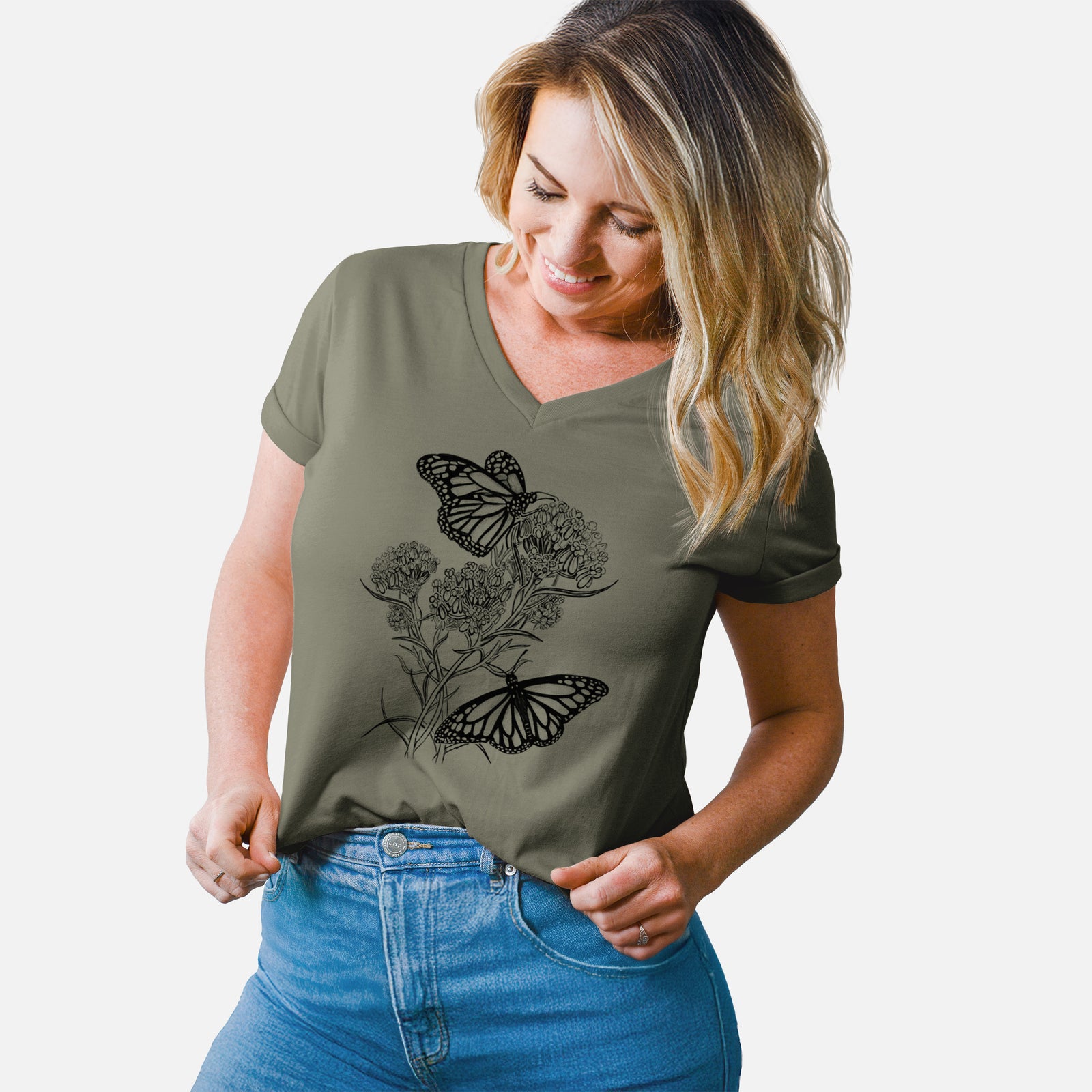 Narrowleaf Milkweed with Monarchs - Women's Lightweight Relaxed Fit 100% Cotton V-neck
