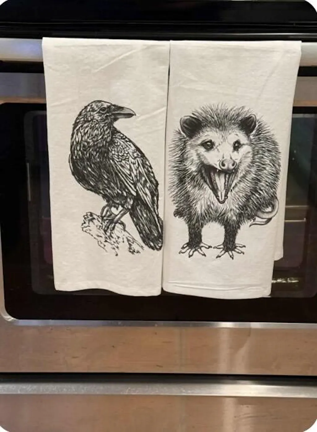 The towels were a gift for my daughter “just for fun”… She lives on Cape Cod & I live in Vermont. We both love crows, opossums & birds in general so got these for her use in her kitchen. I have not seen them in person so can’t opine about the quality of the material. She sounded happy to get them & sent me a photo of them hanging on oven door handle.