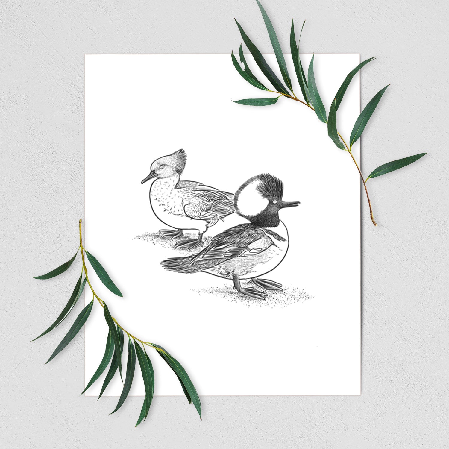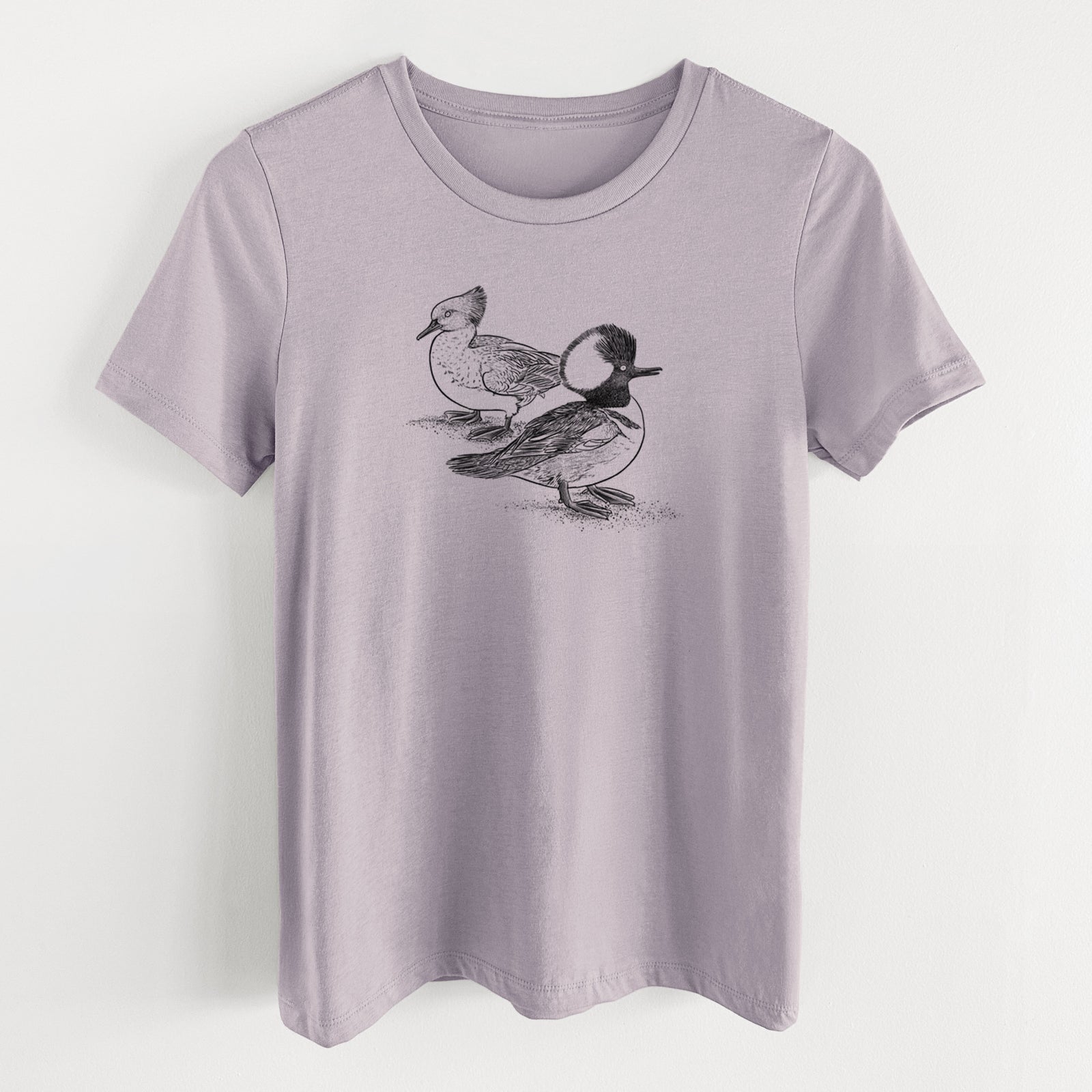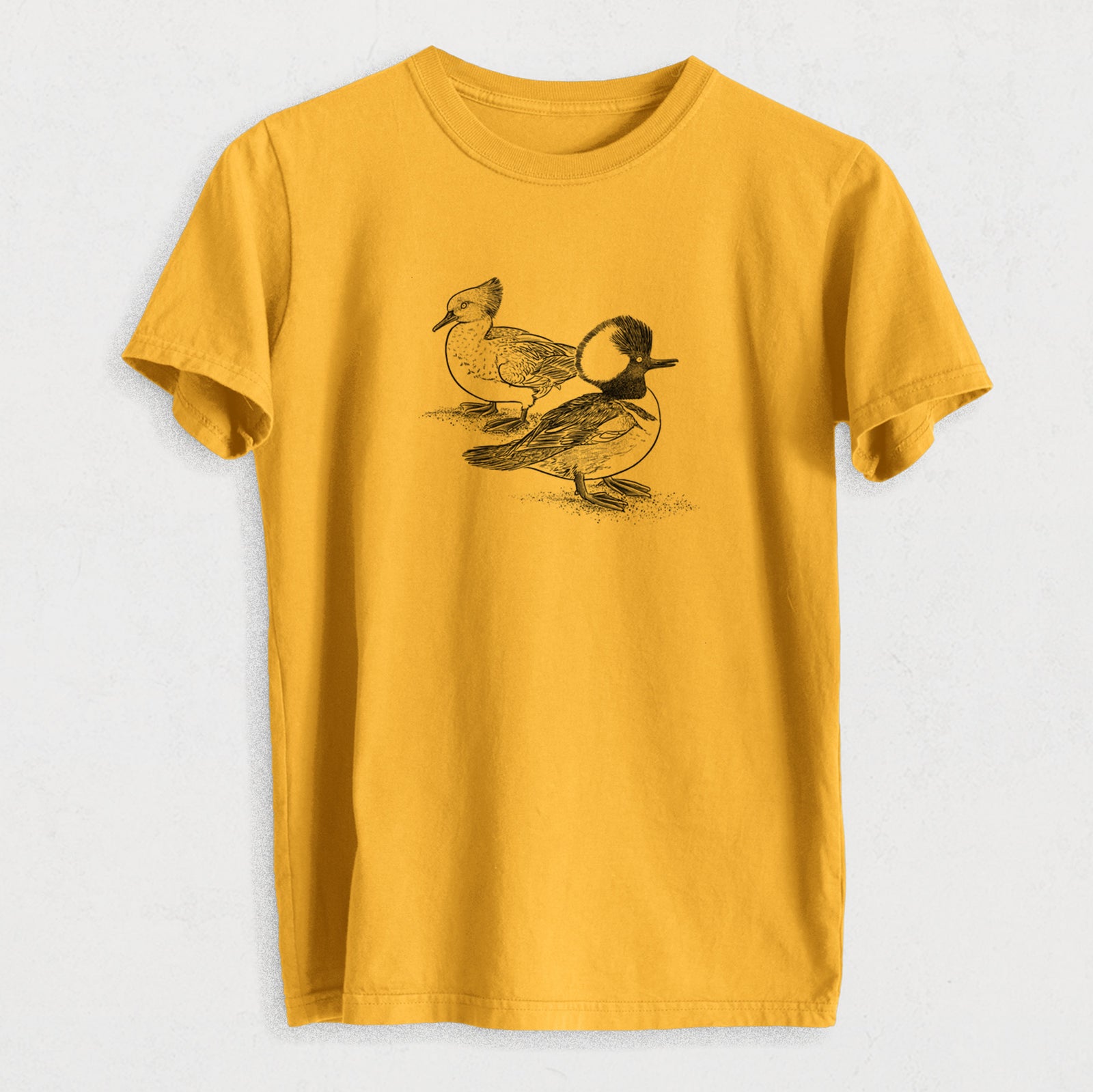 With their bold crests and striking contrast, these Hooded Mergansers make quite the pair. A hand-drawn tribute to this standout duck species, printed on soft, wearable nature art.