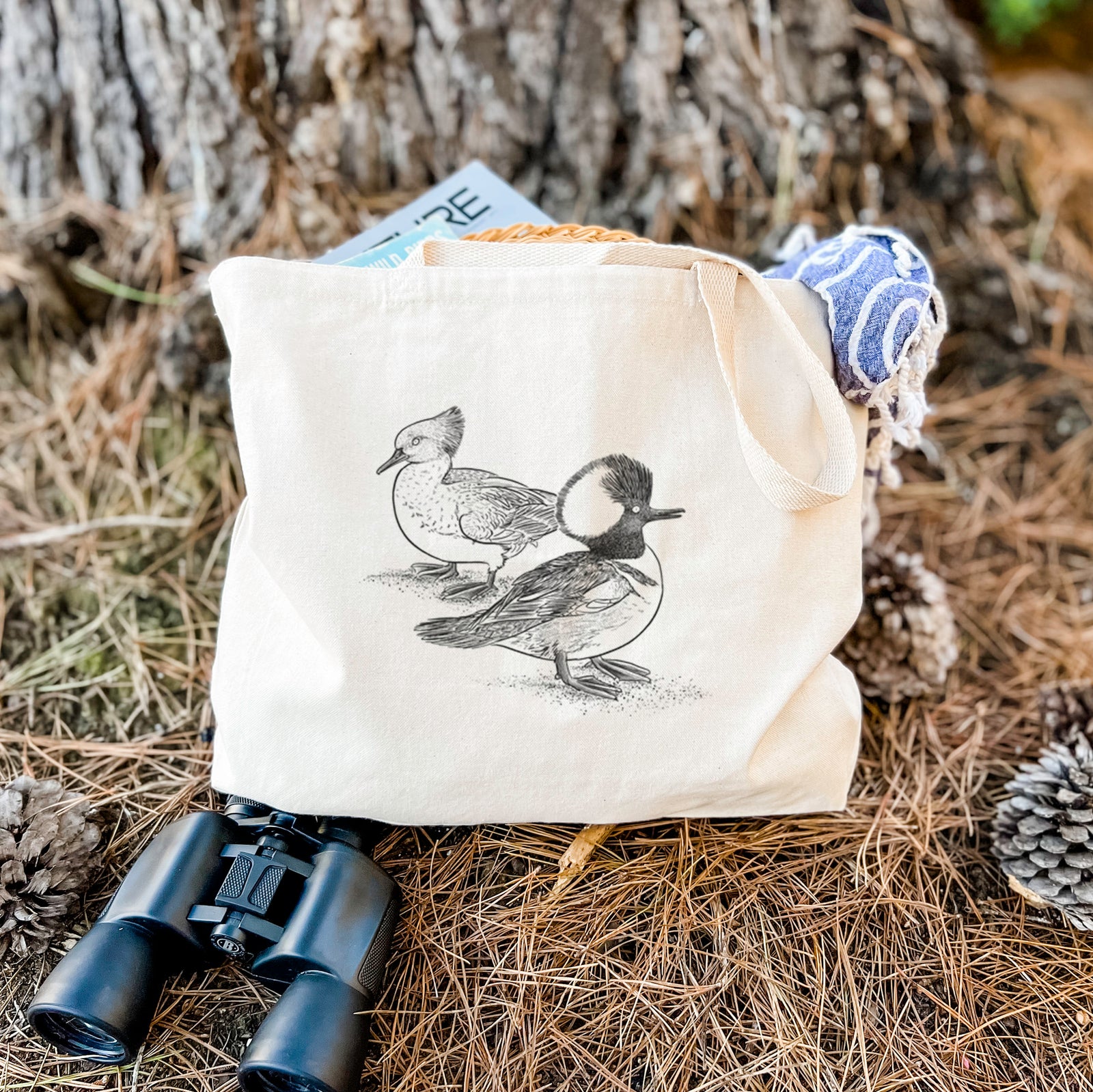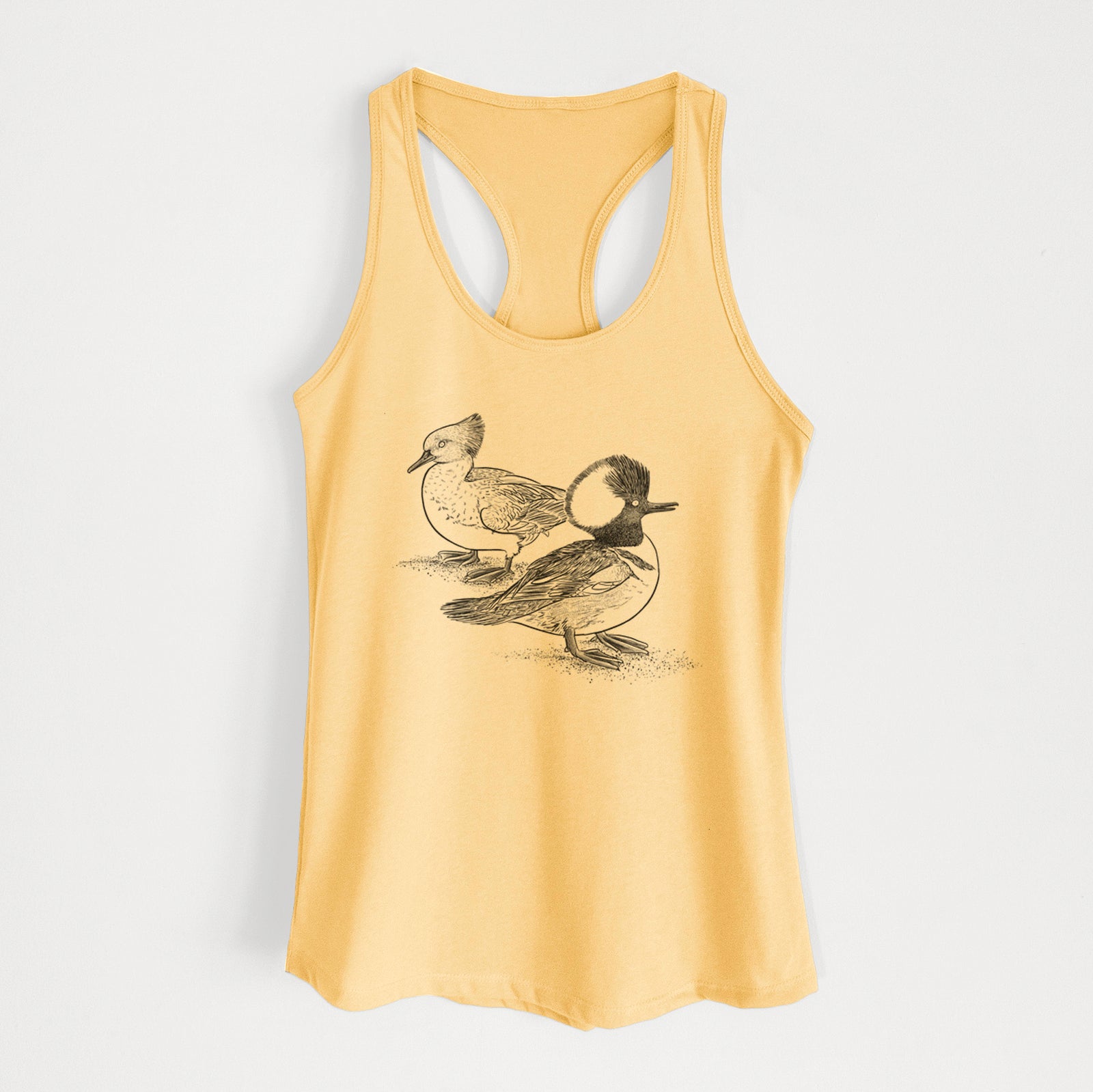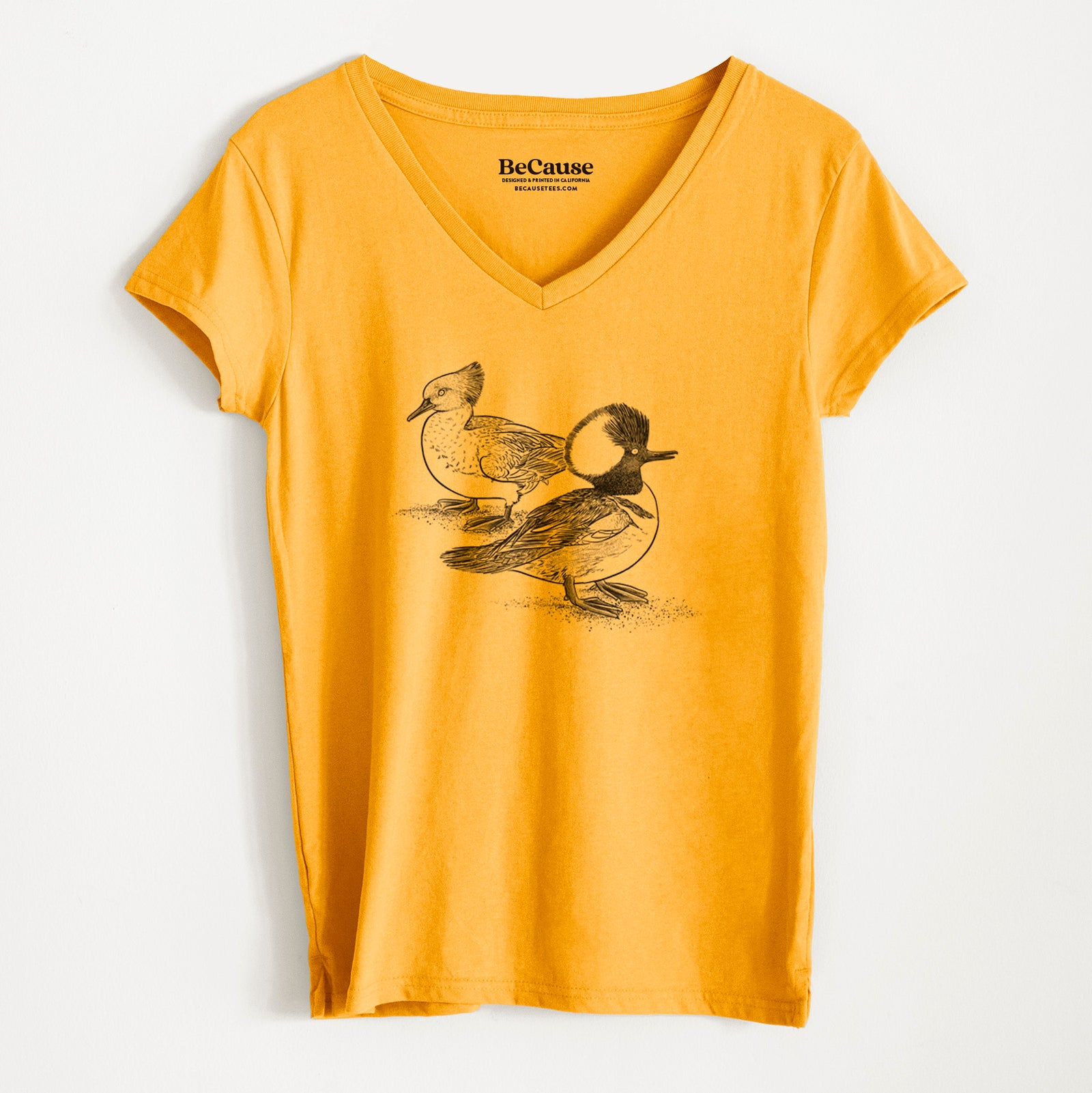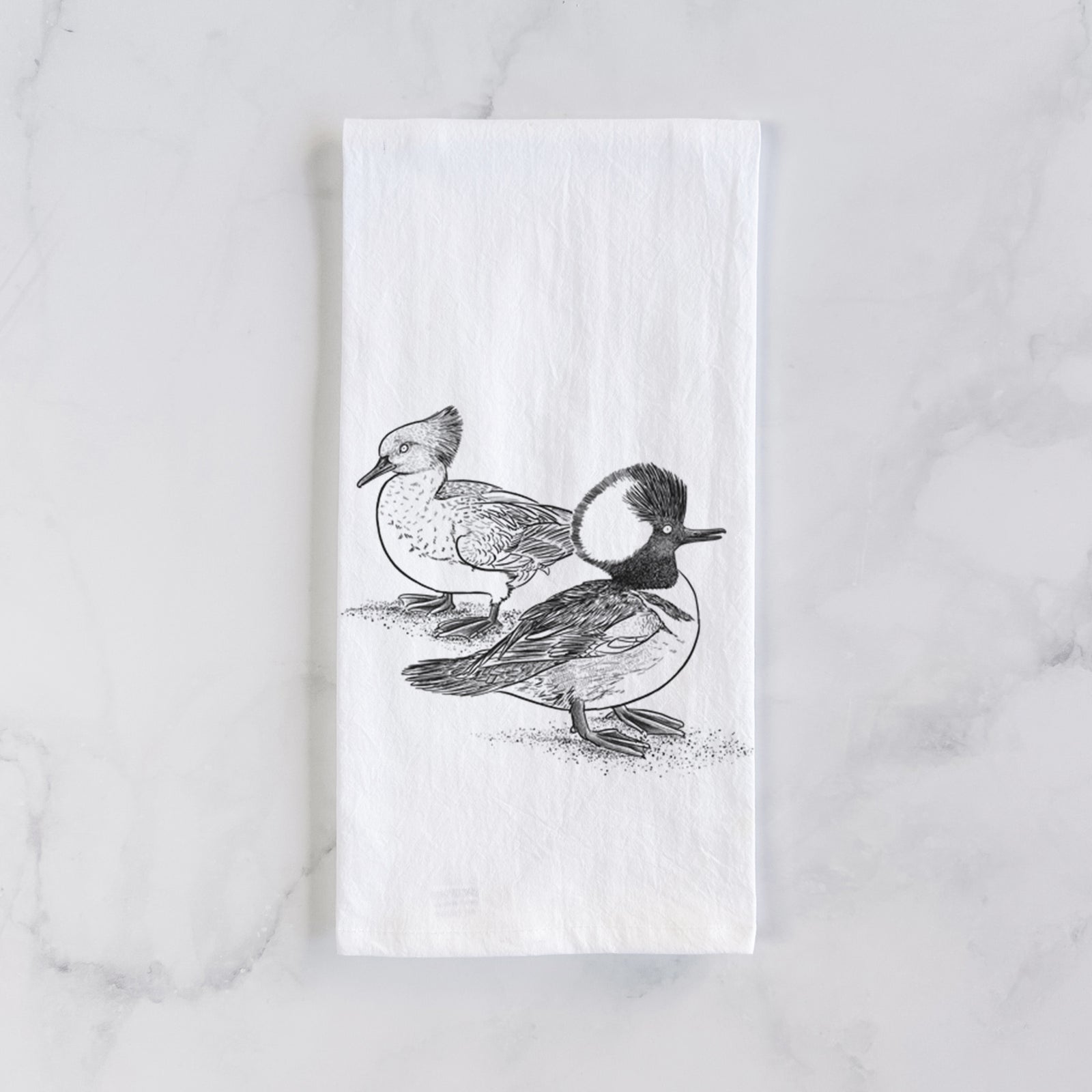 With their bold crests and striking contrast, these Hooded Mergansers make quite the pair. A hand-drawn tribute to this standout duck species, printed on soft, wearable nature art.